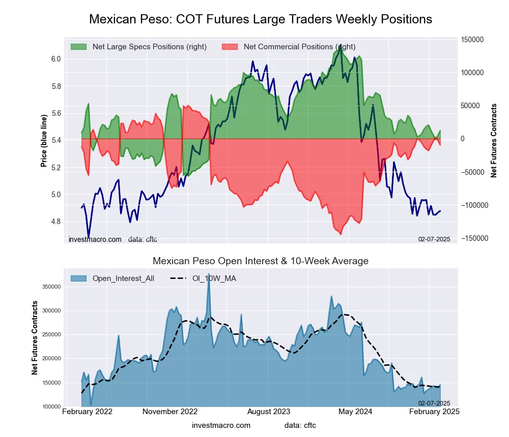 The Mexican Peso large speculator standing this week equaled a net position of 12,262 contracts in the data reported through Tuesday. This was a weekly rise of 7,038 contracts from the previous week which had a total of 5,224 net contracts.