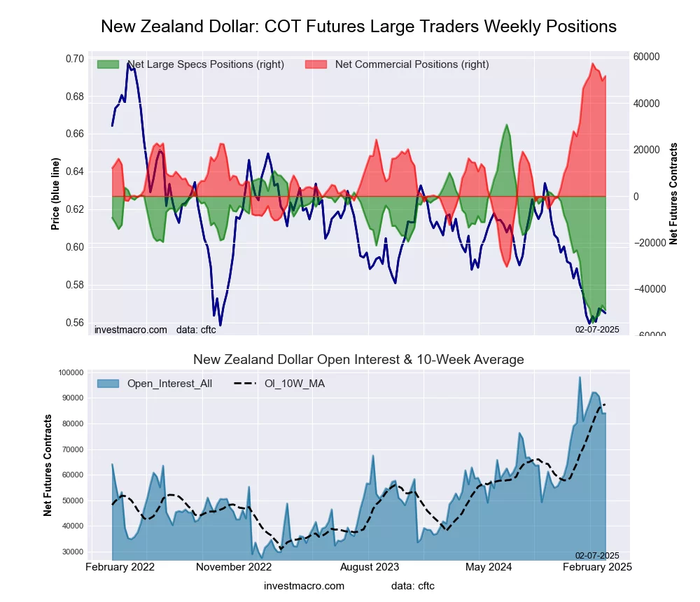 The New Zealand Dollar large speculator standing this week equaled a net position of -49,090 contracts in the data reported through Tuesday. This was a weekly decline of -2,059 contracts from the previous week which had a total of -47,031 net contracts.
