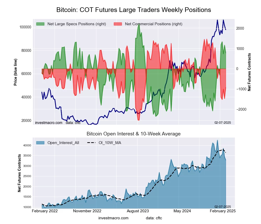 The Bitcoin large speculator standing this week equaled a net position of 786 contracts in the data reported through Tuesday. This was a weekly decrease of -379 contracts from the previous week which had a total of 1,165 net contracts.