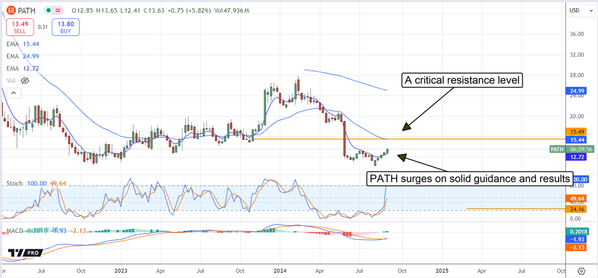 UiPath stock surged nearly 10% in premarket trading, showing significant support above recent lows and potential for a complete price reversal. The critical resistance point is near $15.50 and the 150-day EMA. It may provide resistance to cap gains but, if broken, will be a launch pad to the $20 level.
