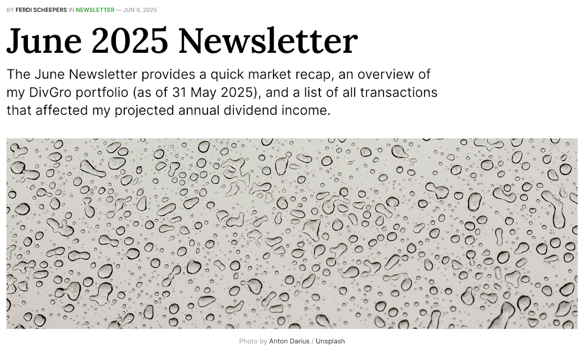 As usual, I provide a quick market recap, an overview of my DivGro portfolio (as of 31 May 2025), and a list of all transactions that affected DivGro’s projected annual dividend income.