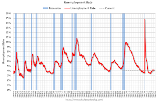 The Employment-Population ratio was unchanged at 59.7% from 59.7% in May (blue line).