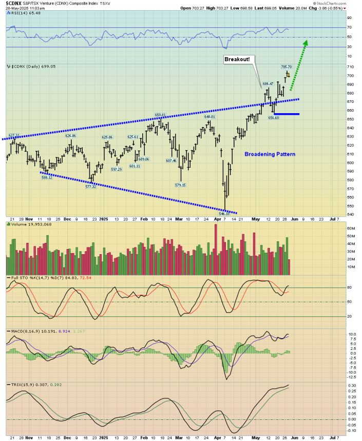 The target of this massive H&S pattern is at least 1500 and as high as round number 2000.  Given the amount of time that has gone into it, it’s reasonable to expect the CDNX to reach much higher prices, even, perhaps, an all-time high.