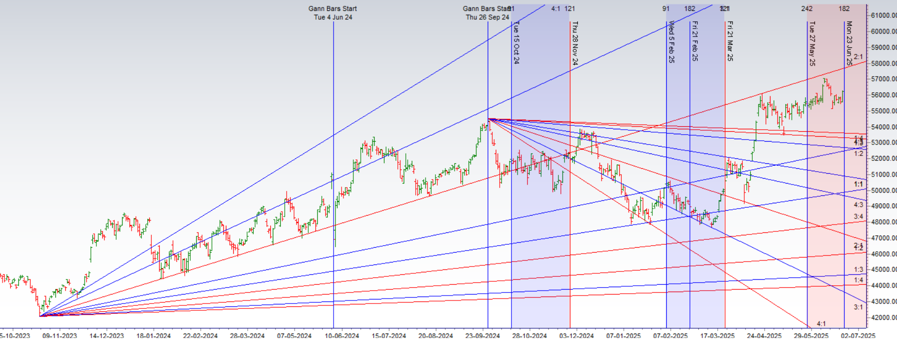 Bank Nifty unable to cross its 2×1 gann angle and broken RBI Day low support at 1×4 gann angle at 53750.