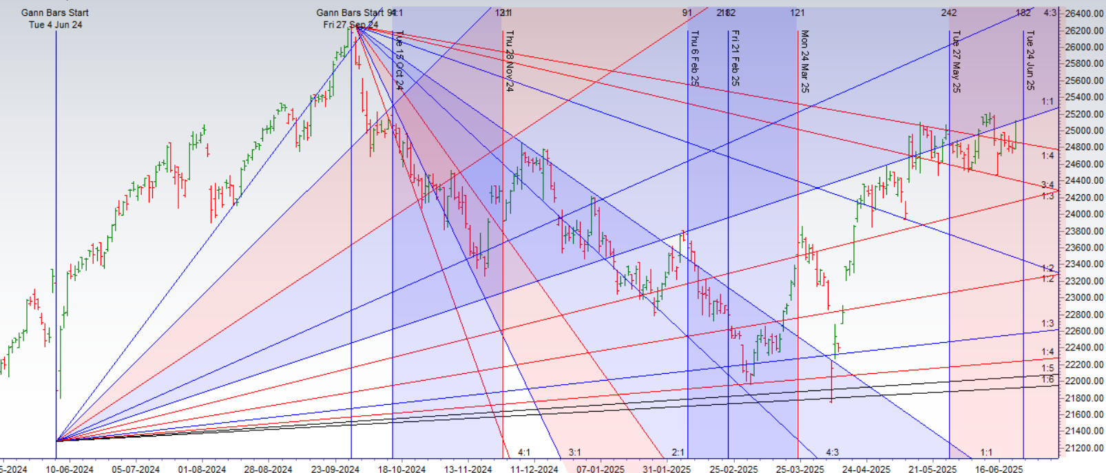 Price has taken resistance at its 1×1 gann line unable to cross the same heading back to 3×4 line at 24681. Also 23 June is gann tune date so potential gann price time squaring.