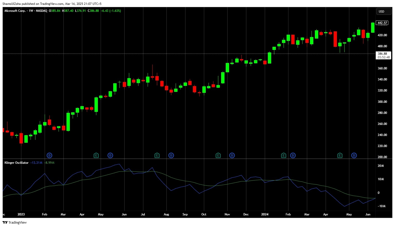 - Crossover Trading Signals: A bullish crossover (Klinger oscillator consists of the main line and signal line) suggests an uptrend, while a bearish crossover signals a downtrend.