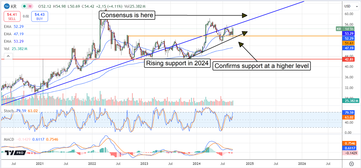 The analyst price target revisions in 2024 are providing a tailwind for Kroger stock, with the sentiment rating up to Moderate Buy from Hold and the consensus target rising. The consensus target implies a 5% upside from the $55 level, a move to $59 and a new multi-year high when reached. A move to $59 is also significant because it would be the highest price action since the ACI merger was released and sets the market up to hit a new all-time high.
