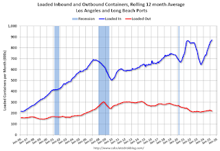 Container traffic gives us an idea about the volume of goods being exported and imported – and usually some hints about the trade report since LA area ports handle about 40% of the nation’s container port traffic.The following graphs are for inbound and outbound traffic at the ports of Los Angeles and Long Beach in TEUs (TEUs: 20-foot equivalent units or 20-foot-long cargo container).