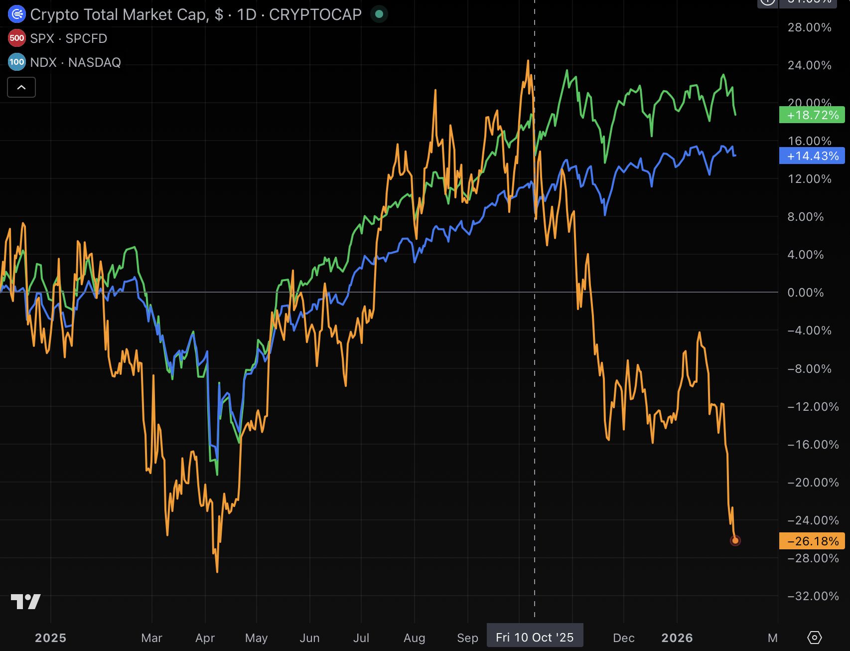 Following months of clear correlation with broad indices like the S&P 500 and Nasdaq 100, crypto decoupled precisely on October 10 — and has trended downward ever since.