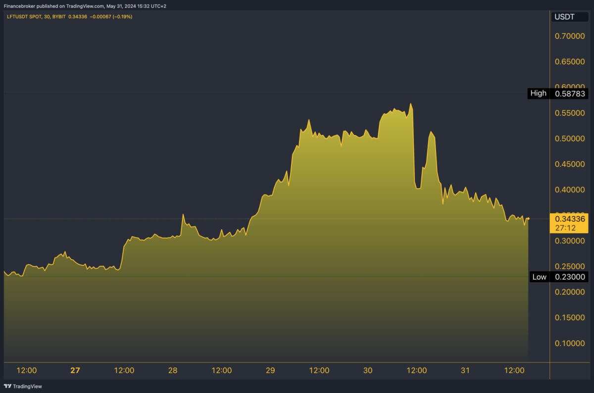 - LFT is currently trading at $0.3447, with a 36.17% drop in 24 hours but a 134.76% increase over the last week.