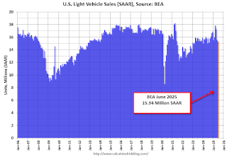 The BEA reported this morning that light vehicle sales were at 15.34 million in June on a seasonally adjusted annual rate basis (SAAR).