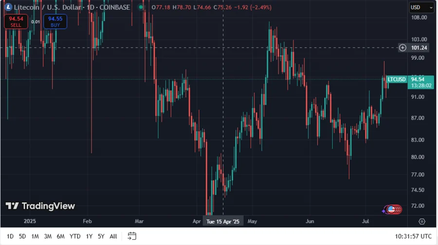 LTC’s value is currently hovering at $94.37, up 1.2% over the past 24 hours. Its price has also been up 8.4%, 8.7%, and 12.9% over the past seven days, two weeks, and one month, respectively, showing the bullish momentum is present and remains intact.