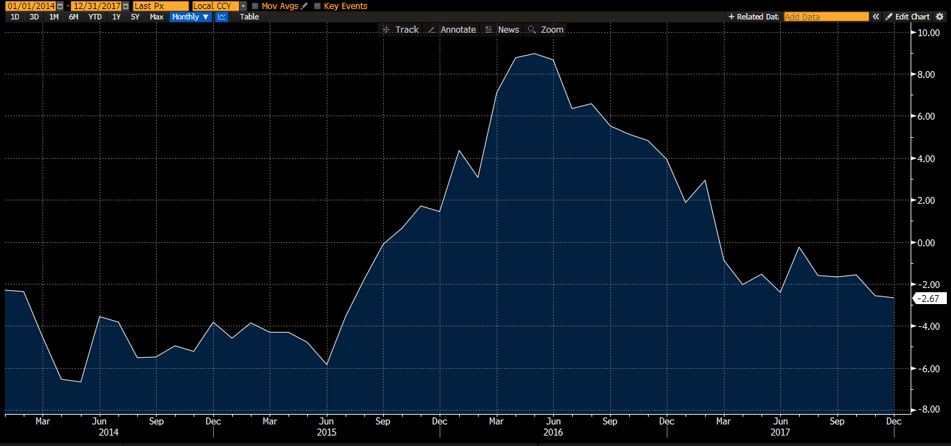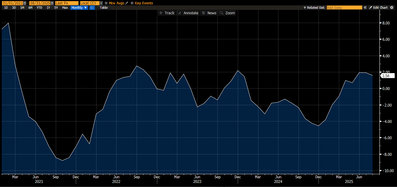 Экономика Китая еще более зависима от кредитов, чем американская, поэтому я использовал индекс Bloomberg Economics China Credit Impulse % 12 Month Change. Вы получили бы похожий график, если бы посмотрели на годовое изменение номинального ВВП в процентах.