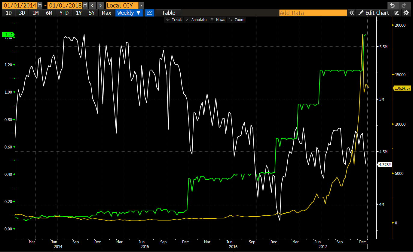 Белая линия — это показатель цены и предложения долларового кредита. Это комбинация банковских резервов, хранящихся в ФРС, и общих прочих депозитов и обязательств банковской системы США. ФРС публикует оба показателя еженедельно. Зеленая линия представляет эффективную ставку по федеральным фондам, которую устанавливает FOMC. Золотая линия — это цена Биткоин/USD.