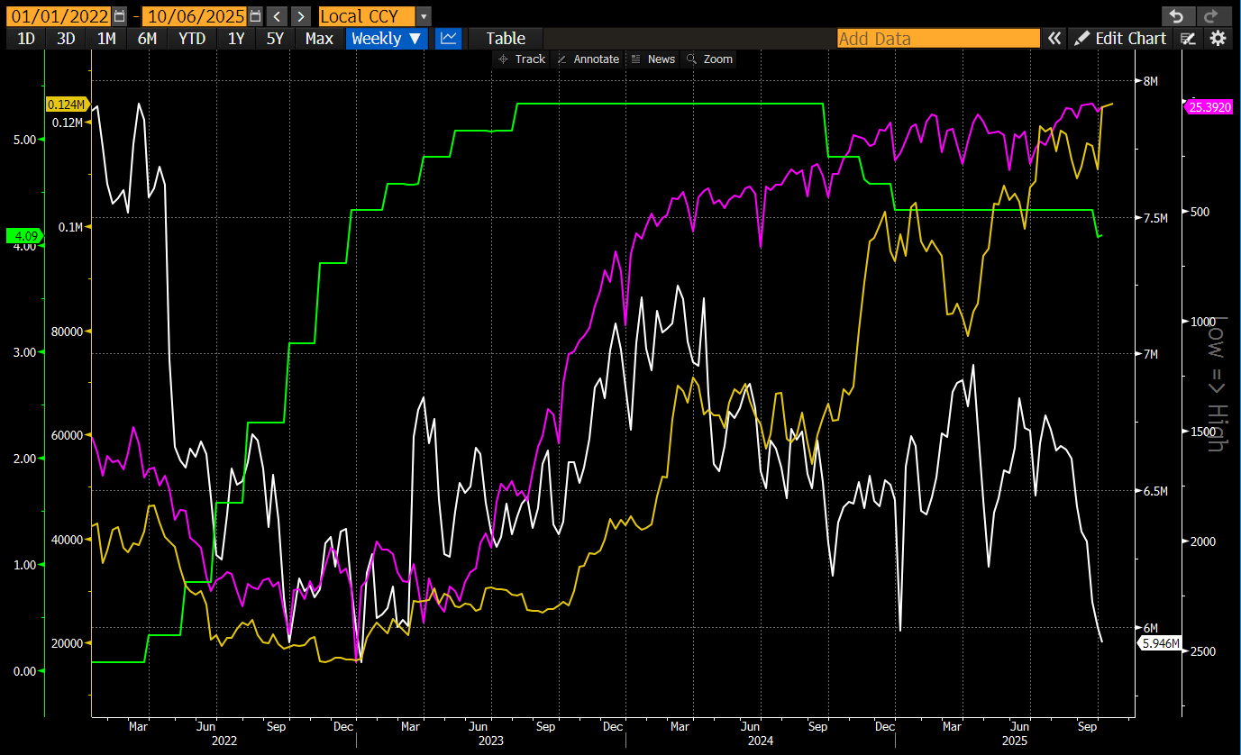 На этот раз двигателем кредитного роста стала программа обратного РЕПО ФРС (RRP, на графике — пурпурная линия с инвертированной осью Y). Цена денег выросла. Предложение денег сократилось. Но Байдену нужно было подстегнуть рынки. Поэтому его соратница, министр финансов США Джанет Йеллен, выпустила больше казначейских векселей, чем нот/облигаций, чтобы осушить программу RRP. Это высвободило на рынки ликвидность на сумму около $2,5 трлн. Ее преемник, Бессент, продолжил эту политику, пока объем RRP не упал до текущего значения, близкого к нулю. Китай вошел в периоды дефляции, о чем свидетельствует отрицательный кредитный импульс. Си оставался приверженцем снижения цен на жилье и его значимости для китайской экономики.