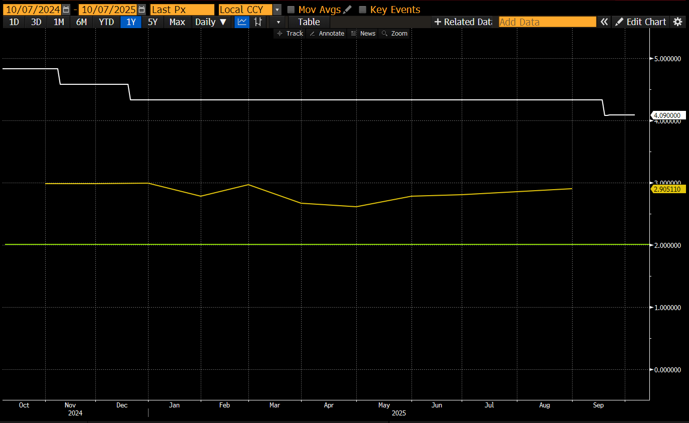 В США новоизбранный президент Трамп хочет «разогреть» экономику. Он регулярно говорит о том, что Америка должна расти, чтобы сократить свой долговой груз. Он резко критикует ФРС за слишком жесткую денежно-кредитную политику. Его желание приводит к действиям. ФРС возобновила снижение процентных ставок в сентябре, хотя инфляция выше ее собственного целевого показателя.