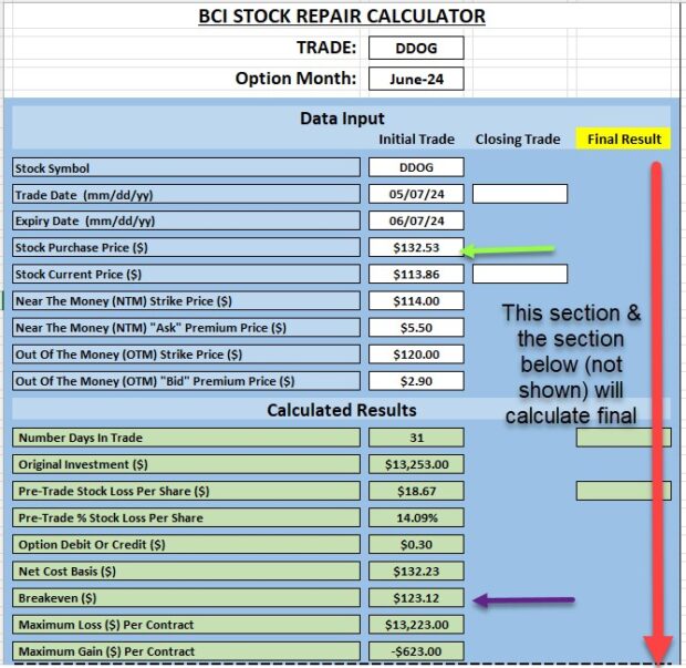 DDOG: Stock Repair Calculator entries & calculations