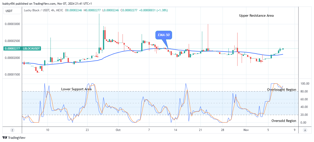 The bulls increased the Lucky Block value to the $0.0000227 resistance level above the EMA-50 shortly after the 4-hourly chart opens today, approaching the upper resistance levels.