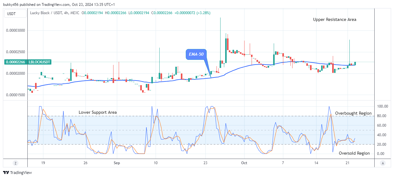 Today, the Lucky Block price is poised to revisit the $0.0000450 price level as the bulls caused a rise to the $0.0000226 high level above the EMA-50 as the daily chart opens, indicating that traders are actively buying at this level and this may likely boost the recovery pattern to revisit the $0.0000450 barrier level at the upside.