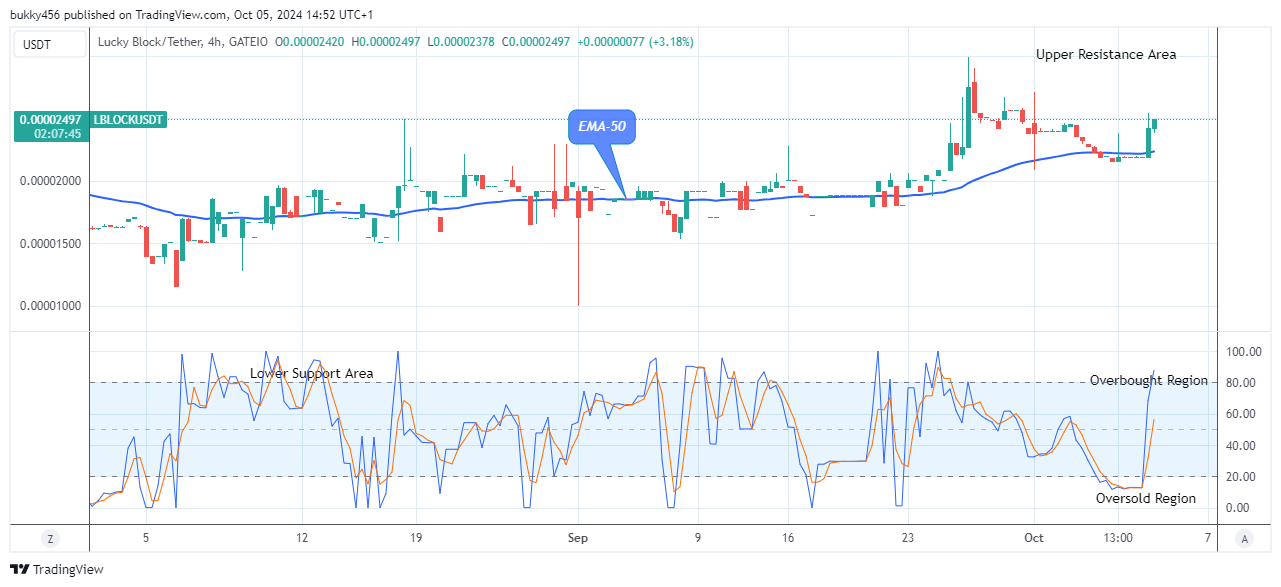 Today, the bulls increased the Lucky Block price to a $0.0000249 high value above the moving average lines as the 4-hour chart opens, revealing a buy signal as the price remains above the supply levels.