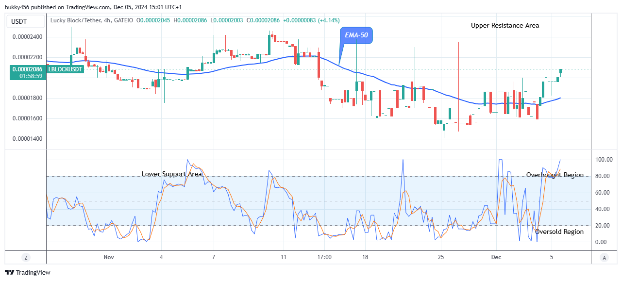 With the Bitcoin price crossing the $100k barrier, the LBLOCKUSD remains firm above the supply levels, showing positive signs above the $0.0000200 supply value, forming a golden cross-chart pattern. If the coin holders could prove stronger and increase the price above the $0.0000398 peak value, the rise may continue and extend further to reach the $0.0001200 resistance level, indicating a remarkable surge with potential gains.