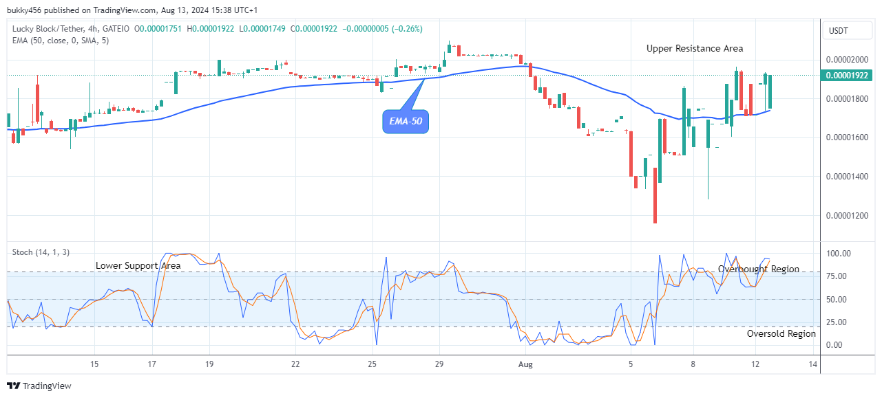 Today, the Lucky Block price is making higher highs and higher lows. However, presently the coin trades at the $0.0000192 resistance value above the EMA-50, implying that buyers are becoming more active as the coin market remains open for bullish growth.