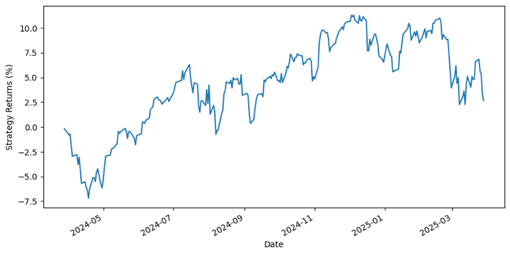 Finally, let’s plot the cumulative returns of our strategy to see how it performs: