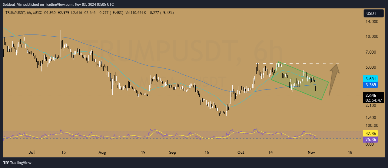 From the end of September to mid-October, the MAGA price went through a surge from the $1.69 support to the $5.44 resistance (dotted line), as shown by the TRUMP/USDT chart analysis on the 6-hour timeframe.