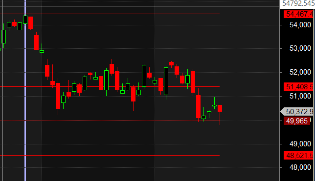 Bank Nifty closed below its 100 SMA @51288 Trend is Buy on Dips till above 50500. 200 SMA @49811