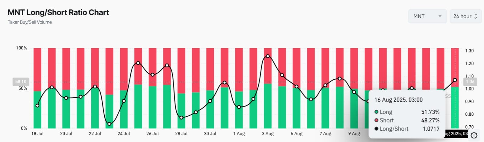 Meanwhile, Mantle’s Long/Short Ratio hit 1.01, with longs accounting for 51.7% and shorts for 48.3% of positions.