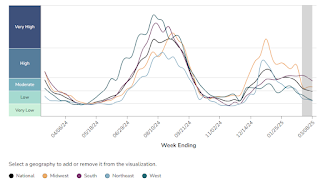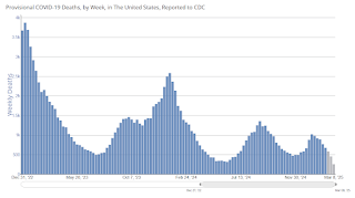 And here is a graph I’m following concerning COVID in wastewater as of March 13th:This appears to be a leading indicator for COVID hospitalizations and deaths. This has moving down recently, but still double the low of last May.
