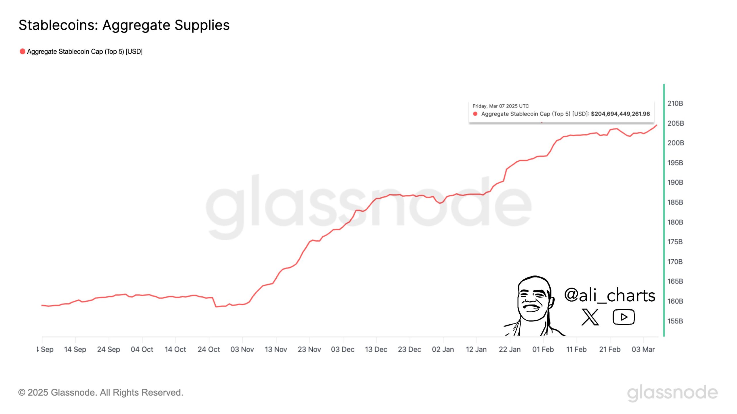 Crypto trader Ali Martinez tells his 131,400 followers on the social media platform X that the top five dollar-pegged crypto assets by market cap have a total valuation of $204.7 billion.