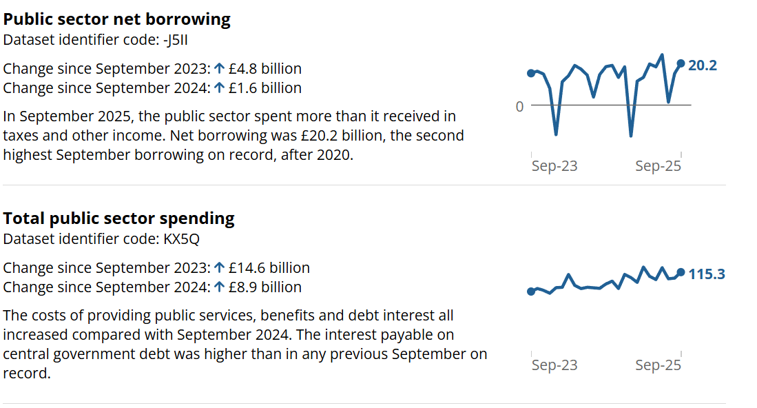 UK public sector net borrowing (excluding public sector banks) widened to £20.2 billion in September 2025 from £18.6 billion in the same month last year, but slightly below market expectations of £20.5 billion. This was the highest September borrowing since 2020