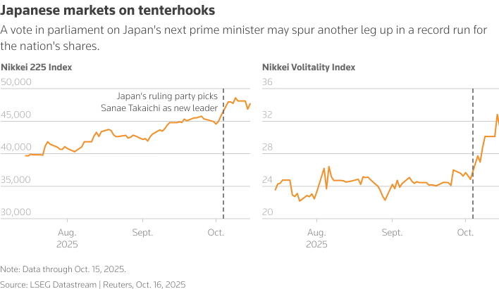 Japanese stocks soared, with the key Nikkei 225 Index closing 0.3% higher at an unprecedented 49,316.06. This rally was driven by the confirmation that pro-stimulus candidate Sanae Takaichi won a crucial parliamentary vote to become the next Prime Minister, which investors see as a signal for continued loose money policies.