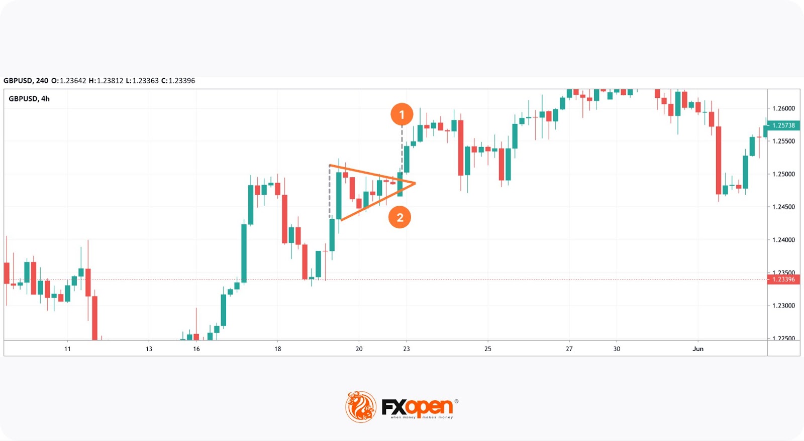 A pattern formed on the 4-hour chart of the GBP/USD pair. As it was a solid uptrend, a trader could expect it to continue. A take-profit level would equal the height of the triangle at its widest part (1) and would be set just from the breakout point. A stop-loss order could be calculated according to the 1:2 risk/reward ratio and placed at point 2.