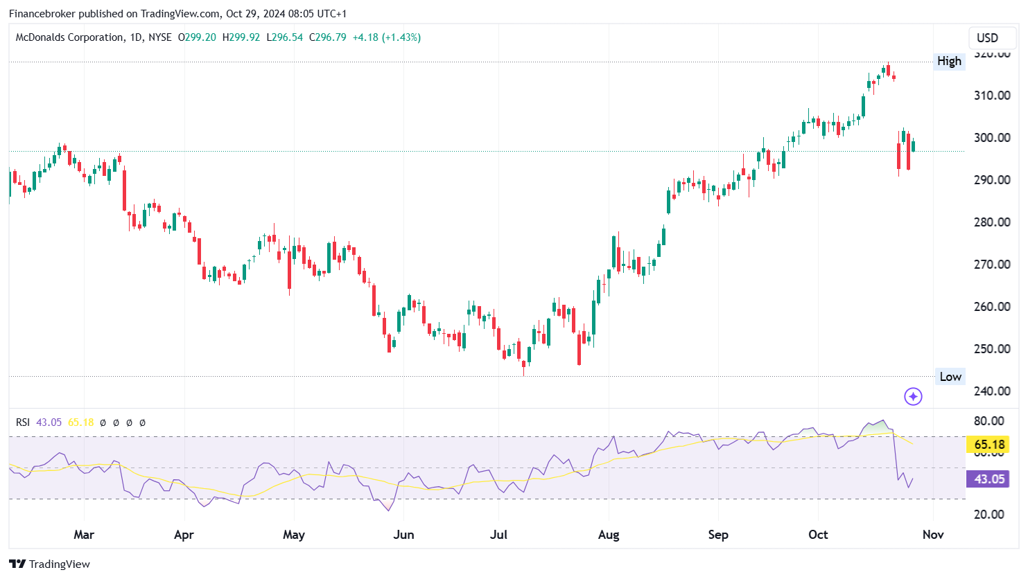 McDonald’s RSI stands at 43.05, which means that the stock is changing in the neutral to slightly oversold region. It could be a prospect for buying when the psychology stabilises. McDonald’s RSI levels were over 65 earlier this year. Yet, the RSI dip recently tells us that the market has lost some of its shine as a result of weaker sentiment, mostly due to some health issues and inflation-rise-related consumer cautiousness.