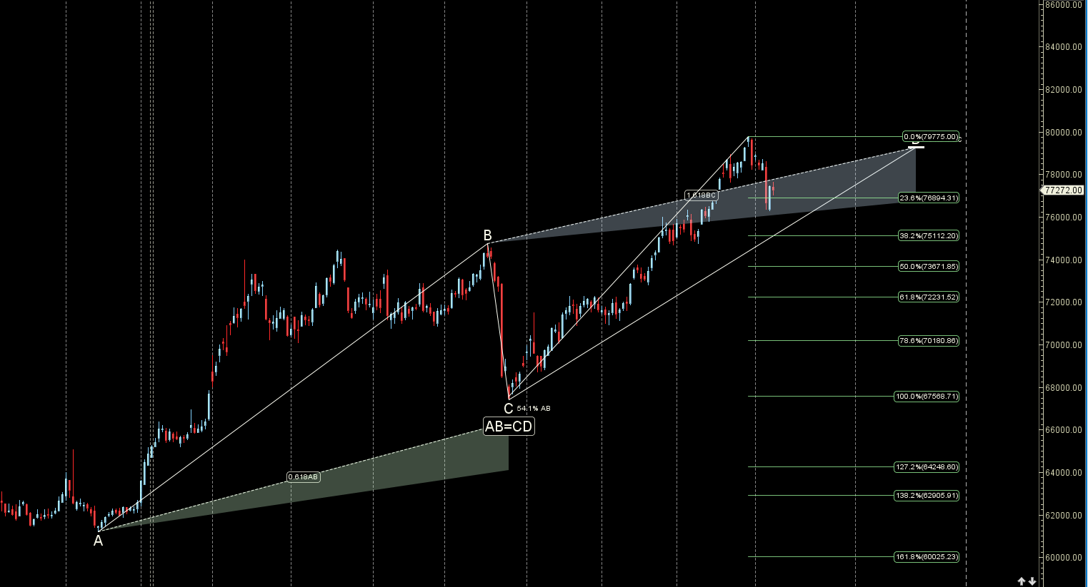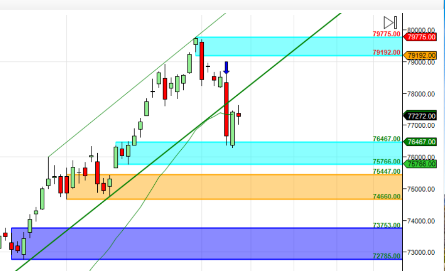 Gold is back to its 3×4 gann angle support,breaking the same can lead to fall back to 76500/76000.