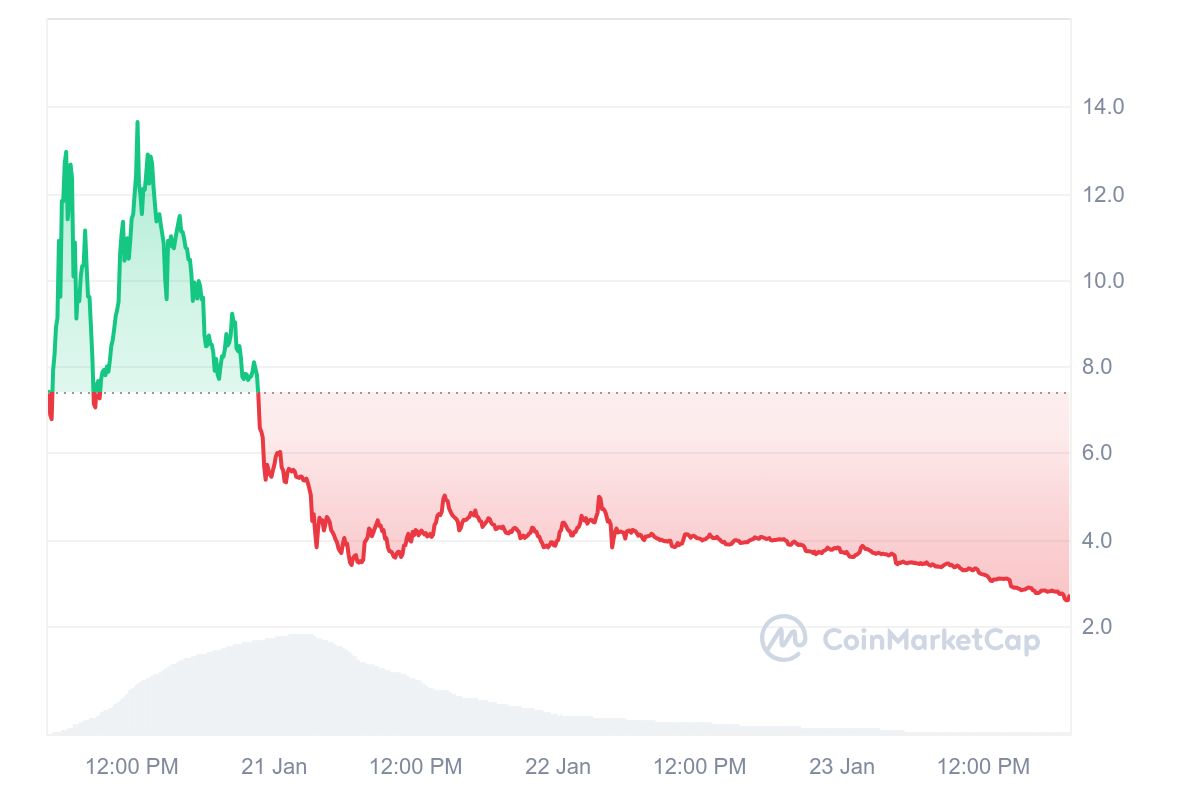 The crypto whale made millions in profits but triggered the sell-off today. The CoinmarketCap data shows a 50% drop in its trading volume, currently at $309.43M. This represents the investors losing interest in this crypto token. As a result, the Melania meme coin price dropped 32% today, reaching an all-time low of $2.57 moments before reporting. With this, the token had declined 80% from its prime of $13.73, concerning investors.