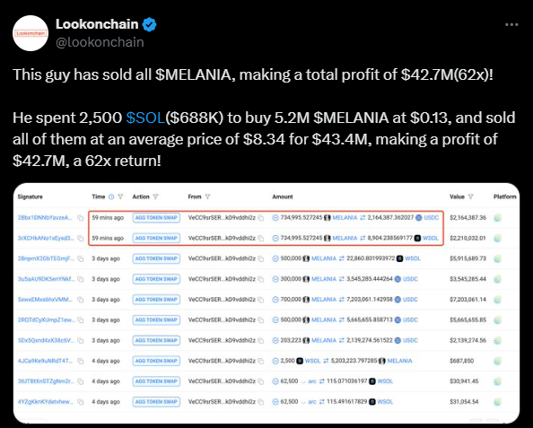 According to the Lookonchain X post, a crypto whale has sold its massive Melania meme coin holdings, crashing the token’s price. The whale initially spent 2,500 SOL, equivalent to $688k, to buy 4.1M MELANIA a few days ago. However, the whale benefited from the ongoing hype, selling a significant portion from time to time but strategically. The whale bought these tokens at an average price of $0.13 but sold them at $8.34, making $43.7M in profits.