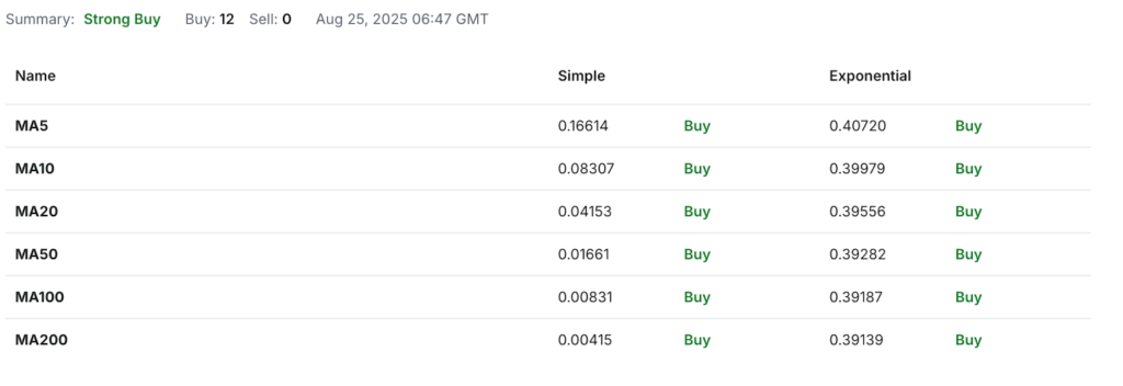 Moving averages are giving the clearest signal. Out of 12 tracked averages, all 12 point to a Buy, with none showing a sell signal. Both simple and exponential moving averages suggest MemeCore’s price remains above important support levels, ranging from MA5 at $0.16614 to MA200 at $0.39139. This confirms that MemeCore is holding a strong trend above long-term averages.