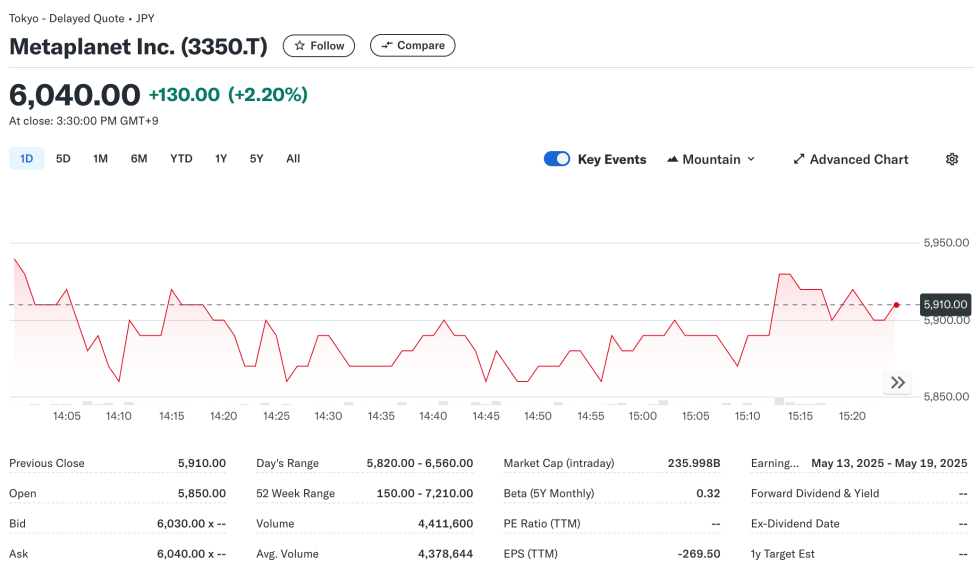 Following today’s announcement, Metaplanet’s stock closed the day up 2.2% at 6,040 yen, or $39.88. On a YTD basis, the stock has surged 73.58%, while over the past year, it has delivered an astonishing return of 3,600%.