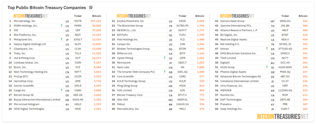 The biggest public Bitcoin treasury companies. Source: Bitcoin Treasuries