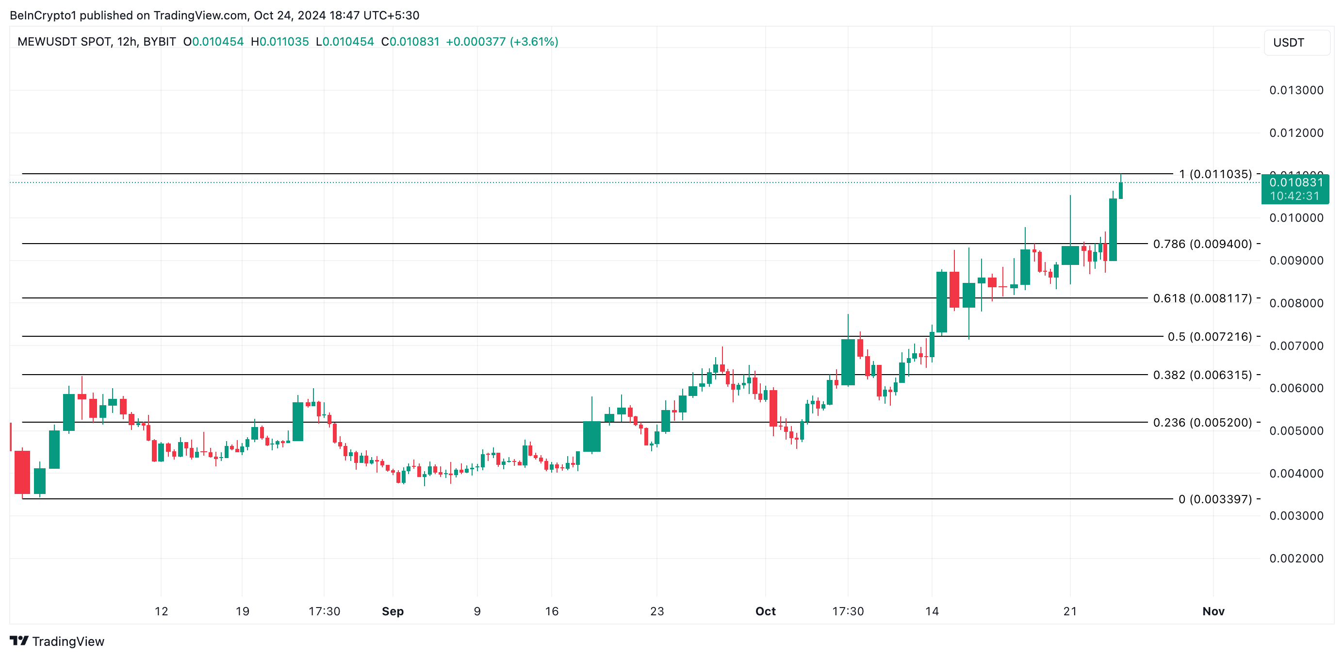 MEW briefly surged to a new all-time high of $0.01066 on Thursday before experiencing a slight pullback. As of this writing, the meme coin is trading at $0.01056, down 2% from its peak.