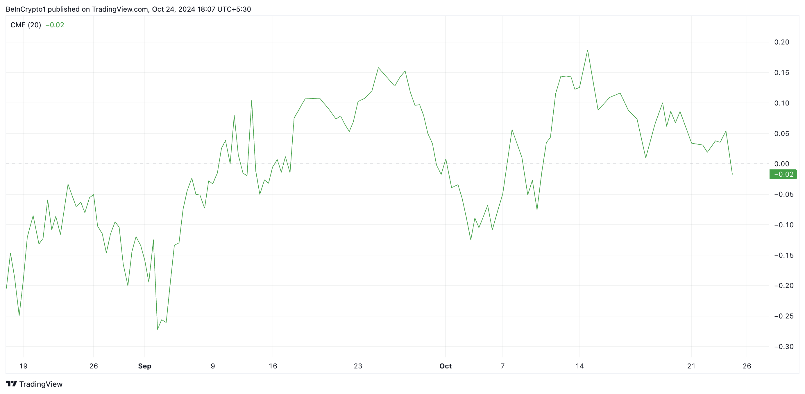 The CMF measures money flow into and out of an asset. When its value is below 1, it suggests that selling pressure is dominant, indicating that more money is flowing out of the asset than into it. It is a sign that investors are offloading positions, reducing the likelihood of a continued upward trend.