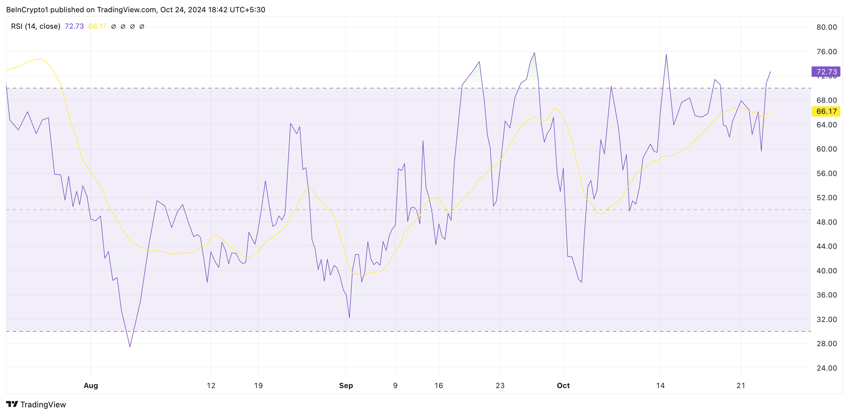 MEW’s RSI reading of 72.73 signals that it is overbought. It hints at potential buyer exhaustion and suggests the likelihood of a price pullback in the short term as traders start to sell to lock in profits.