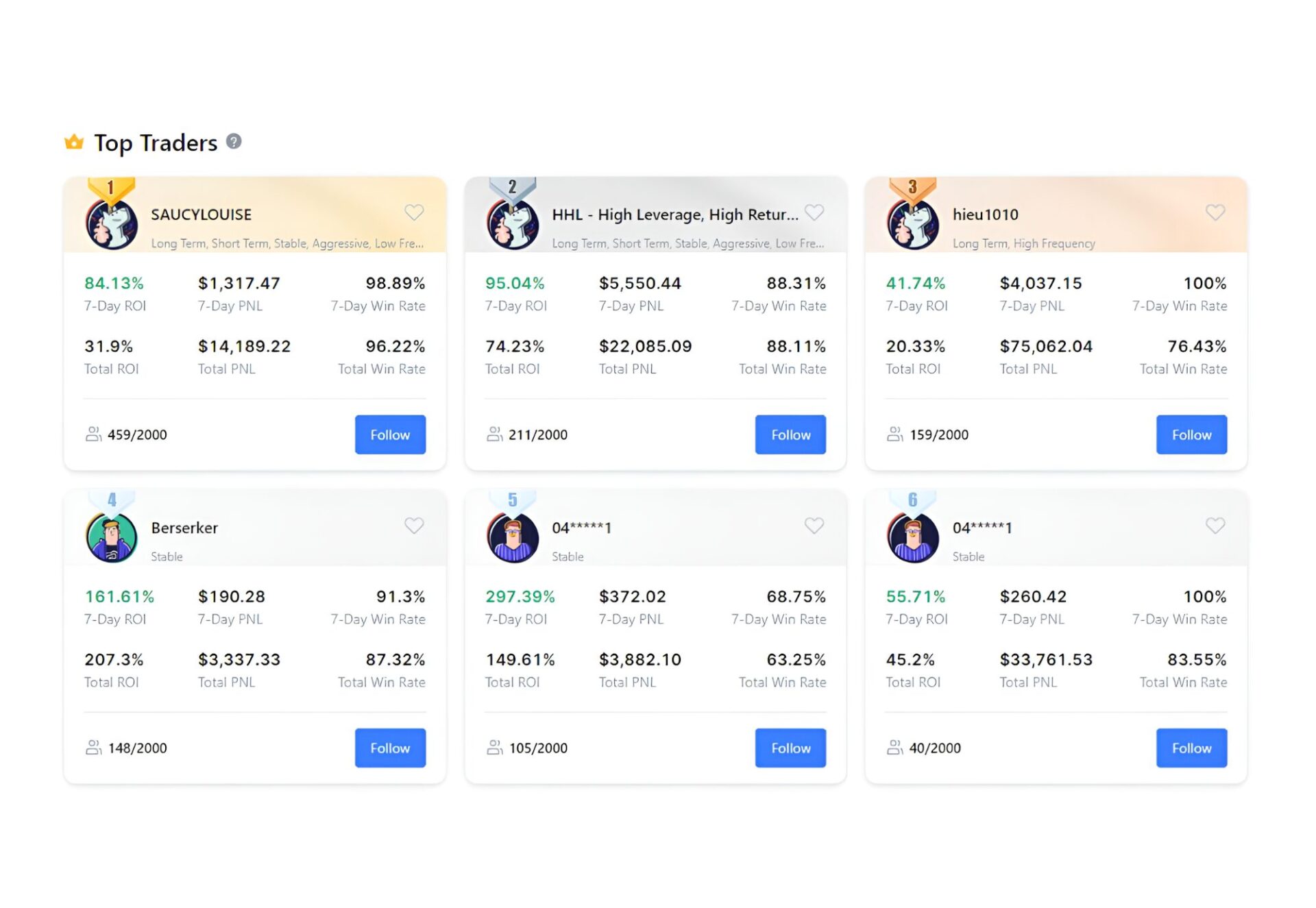 MEXC’s Copy Trading feature allows new users to automatically replicate the trading strategies of experienced traders in futures markets. You can select active traders based on their track record and performance metrics, such as return on investment (ROI), 7-day win rate, and profit and loss (PNL).