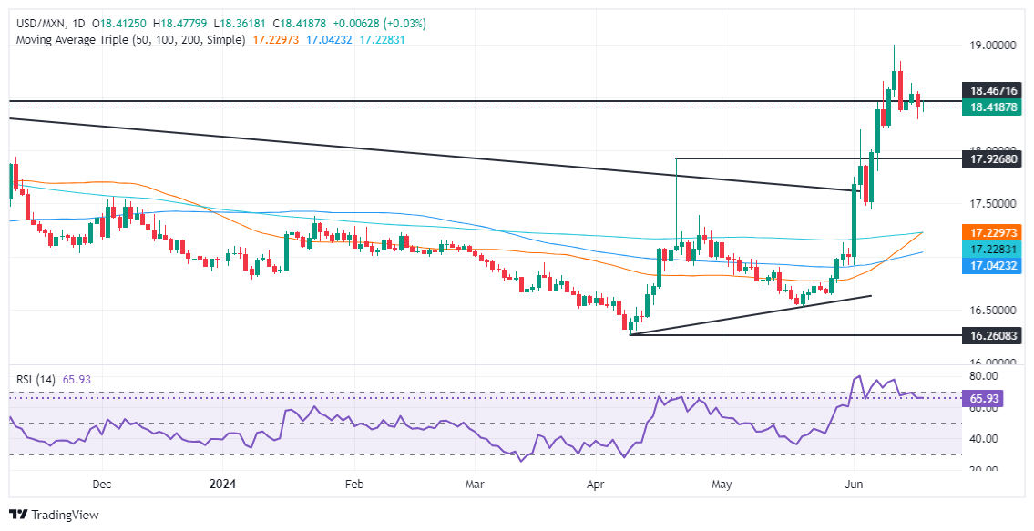 The Mexican Peso registers minuscule losses versus the US Dollar on Wednesday after recovering some ground in the last five trading days. A scarce economic docket in Mexico and the United States (US) leaves the emerging market currency leaning on political developments. The USD/MXN trades at 18.41, up 0.08%.