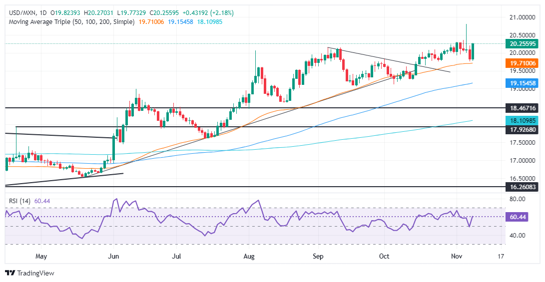 As mentioned throughout the whole week, the USD/MXN bias is upwards, and the correction post-November 5 seems to be reversed. Sellers had lost steam, and buyers re-emerged at around 19.70, pushing the exotic pair above 20.00.