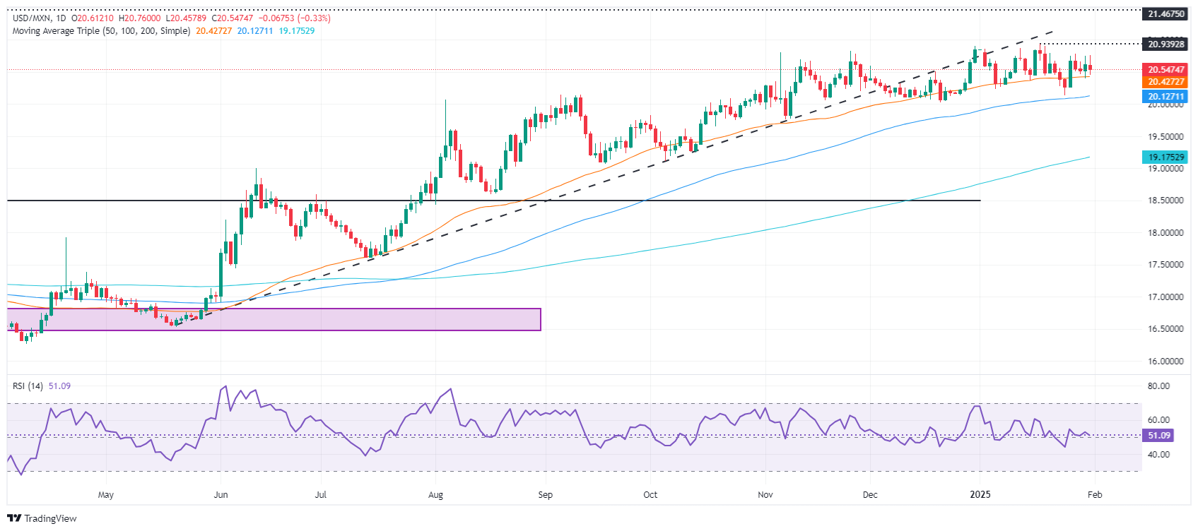 The Mexican Peso (MXN) erases some of its earlier gains and losses ground against the US Dollar (USD), down a minimal 0.07% on Friday, extending its drop after losing more than 1% on Thursday. The tariff trade continues to boost the Greenback, after The White House confirmed that President Donald Trump will enact 25% tariffs on Canada and Mexico, beginning on February 1. The USD/MXN trades at 20.72 after hitting a daily low of 20.45.