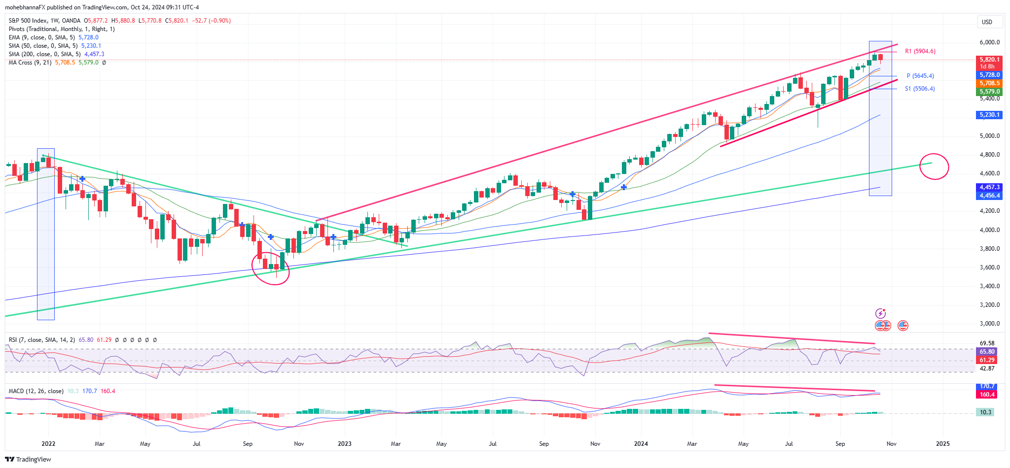 - A confluence of support lies below the price, represented by the EMA9 and the SMA9 intersecting with the monthly pivot point 5645.4, a second confluence of support lies below, represented by the SMA21, the redline lower channel border and the monthly S1 standard calculation of 5506.4.